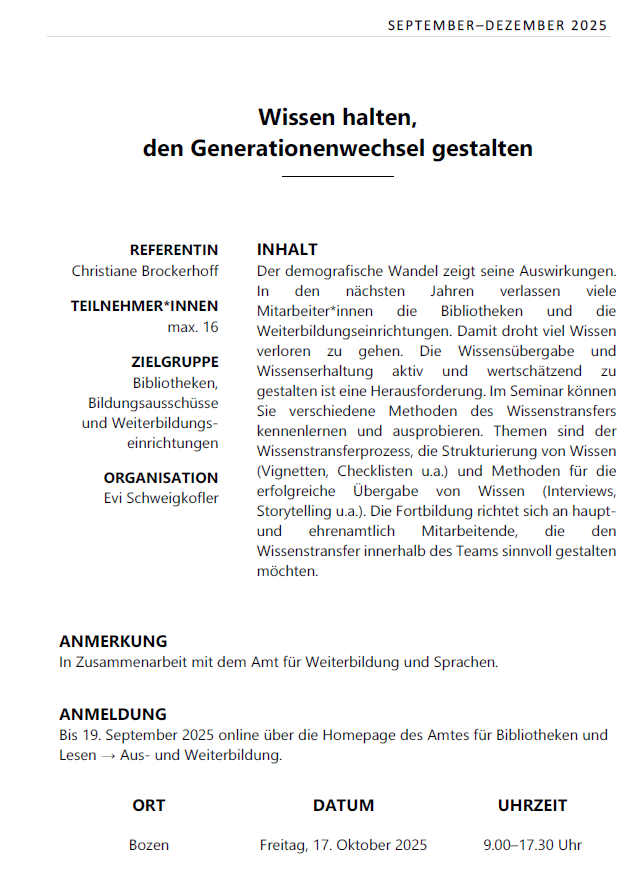 Freie Plätze Fortbildung "Generationenwechsel" |